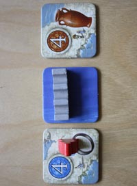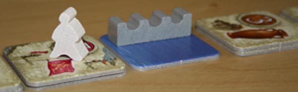 Zum anderen kann bzw. muss man für die Überquerung bezahlen. Der Preis für eine Überquerung richtet sich dabei nach dem niedrigeren Wert der beiden Wegplättchen, die sich unmittelbar vor und hinter dem Wasserplättchen befinden. Bezahlen kann man entweder mit bereits eingesammelten Wegplättchen oder aber mit den Bewegungskarten auf der Hand (Eine Karte = 1 Punkt).