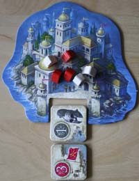 Jeder Spieler wählt eine Farbe und nimmt sich seine drei Spielfiguren. Zudem erhält jeder Spieler eine Brücke.