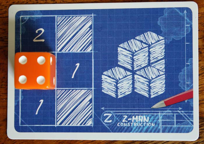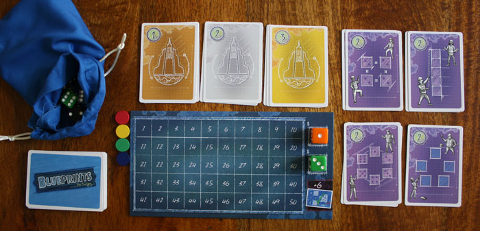 Im Würfelspiel Blueprints von Z-Man Games schlüpft jeder Spieler in die Rolle eines Architekten und muss sein Gebäude gemäß dem vorgegebenen Bauplan errichten. Dafür steht allen ein Spielern ein gemeinsamer Baustoffmarkt zu Verfügung, der verschieden farbige Würfel beinhaltet. Aus dem Baustoffangebot können sie passende Würfel (=Baustoffe) auswählen und Siegppunkte bringend im jeweils eigenen Gebäude verarbeiten.