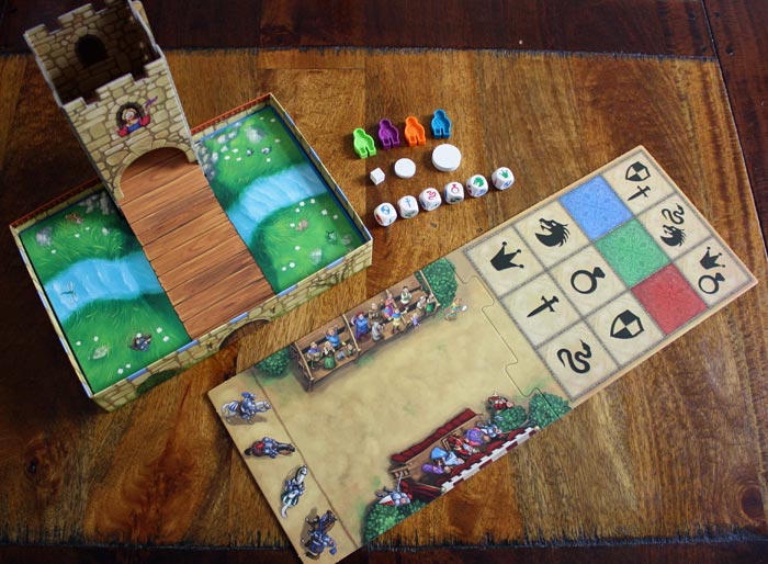 Der Spielplan wird aufgebaut. Hierzu muss der Würfelturm gefaltet und in die Aussparungen der Spielbox gesteckt werden. Die Zugbrücke muss dabei leicht hochgeklappt werden, damit die Würfel durch den Turm auf den Spielplan rollen können. Jeder Spieler entscheidet sich für einen Ritter und stellt diesen auf die Burgmauer neben dem Würfelturm.