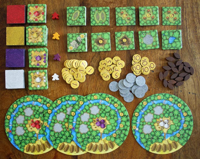 Alle Münzen, Sonnensteine und Cacao-Früchte werden als allgemeine Vorräte getrennt voneinander um die Startfelder herum ausgelegt.