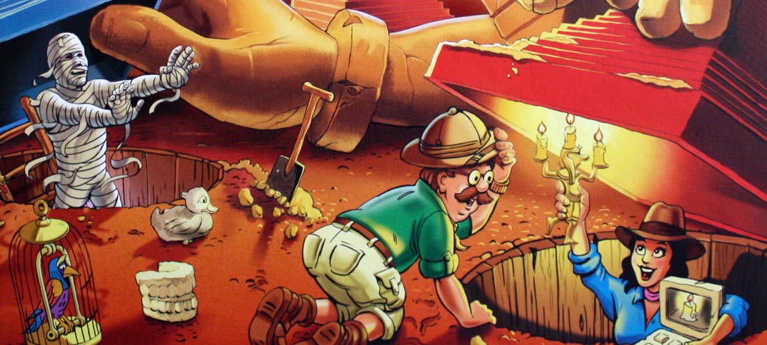 Das Feld zeigt den falschen Schatz (2): Verschiebt ein Spieler eine Pyramide und findet einen Schatz, der allerdings aktuell nicht gesucht wird, dann endet der Spielzug des Spielers sofort und der nachfolgende Spieler kommt an die Reihe. Dieser muss nun ebenfalls denselben Schatz suchen, an dem der vorherige Spieler “gescheitert” ist.
