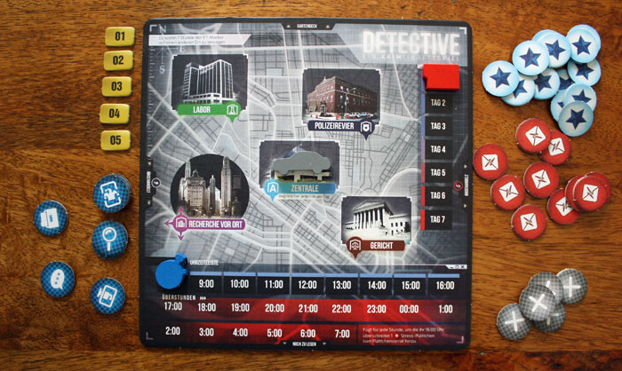 Ein gutes Zeitmanagement ist wichtig, denn so ziemlich alles in Detective kostet Zeit. Auf dem kleinen Spielbrett bewegt sich das Ermittlerteam mit seinem Fahrzeug zu unterschiedlichen Orten – zum Gericht, ins Labor, auf ein Polizeirevier oder zu anderen relevanten Schauplätzen. Jeder Ortswechsel kostet dabei immer eine Stunde. Folgen die Ermittler an diesen Orten Spuren, dann kostet auch dies Zeit. Wieviel Stunden ein einzelner Hinweis kostet, lässt sich auf der jeweiligen Fallkarte ablesen, deren Spur man gerade nachgegangen ist. Null bis drei Stunden sind möglich. Übrigens erfährt man die Zeitkosten erst, wenn man die Karte aufdeckt. Zeitlich planen ist also nur begrenzt möglich. Zum Glück darf man in Detective auch Überstunden machen, was aber Stress verursacht, dargestellt durch eigene Stressmarker, die am Ende des Spiels Minuspunkte bringen.