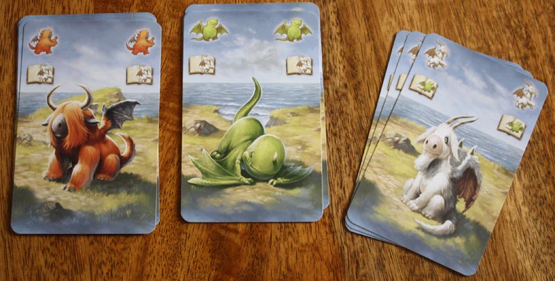 Im Spiel befinden sich 4 unterschiedliche Drachenarten (grün, blau, weiß und orange). Der weiße Weidedrache, der rote Felldrache, der blaue Schieferdrache und der grüne Sumpfdrache. Zusätzlich gibt es den schwarzen Gegenlicht-Drachen, der als Joker für jede beliebige Farbe genutzt werden kann. Das oberste Symbol auf jeder Karte bestimmt die Drachenart. Das darunter befindliche Symbol verrät, was sich auf der Rückseite jeder Drachenkarte befindet, also entweder eine Zahl + Belohnung oder eine andere Drachenart.