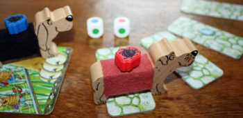 Der rote Spieler würfelt die Farbe blau, die sich auf seinem eigenen Hund befindet (siehe Bild in der Spielvorbereitung) und die Farbe rot, die sich auf dem schwarzen Hund befindet.