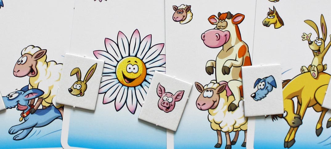 Alle Gänseblümchen- und Tierkarten werden zusammen gemischt und als verdeckter Nachziehstapel in die Tischmitte gelegt.