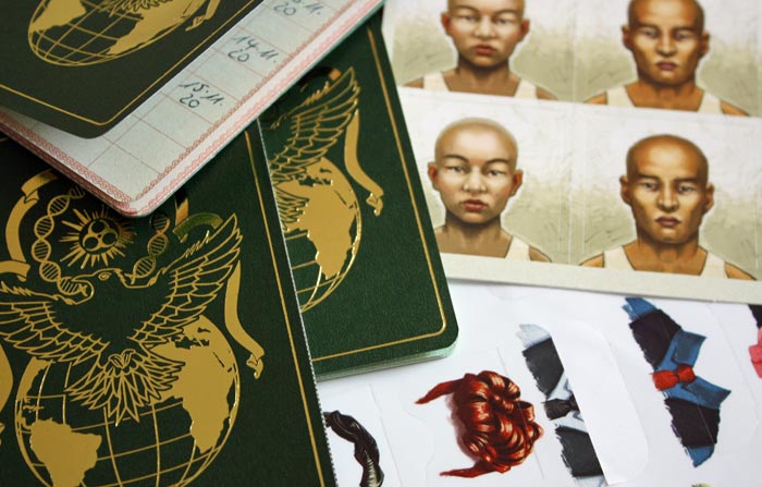 Pässe & Tarnung: Vier wunderschöne Pässe liegen dem Spiel bei. Noch vor dem ersten Spiel erstellt sich jeder Spieler ein eigenes Profil. Das bedeutet, er erhält ein Passfoto, dass mit Kleidung, Haaren und weiteren Dingen ausgeschmückt werden darf. Eine Sonderfähigkeit bekommt jeder neu erstellte Charakter gleich dazu. Einige Felder bleiben frei. Die meisten davon für künftige Spezialisierungen. Ein Tarnleiste ist ebenfalls vorhanden, auf der der aktuelle Grad der Tarnung festgehalten wird. Ein Spion kann im Spielverlauf also auch enttarnt werden.
