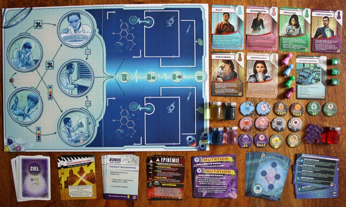 Benötigtes Material: 1 Laborspielplan, 14 Sequenzkarten, 5 Heilmittel-Ampullen, 1 Laborübersichtskarte pro Spieler, die überarbeiteten Rollenkarten der Epidemiologin und der Forscherin.