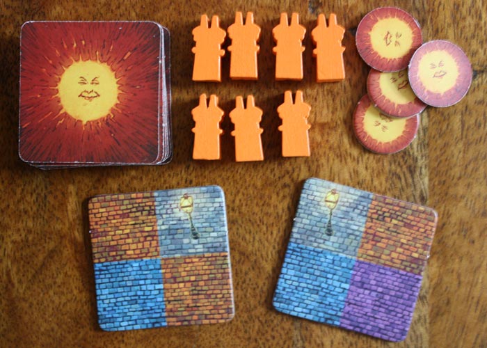 Jeder Spieler erhält 4 Aktionsmarker, 7 Schornsteine und 8 Straßen-Plättchen. Zwei Straßen-Plättchen nimmt jeder Spieler sofort auf die Hand. Die restlichen Straßen-Plättchen bilden jeweils den eigenen Nachziehstapel.